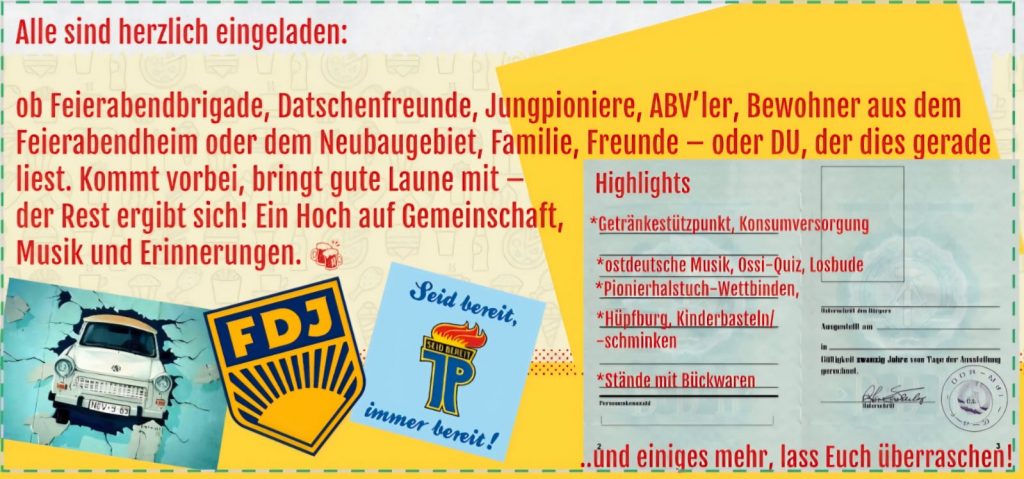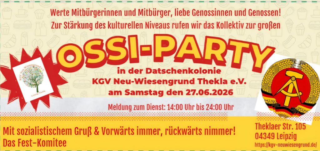 Am 27.06.2026 von 14:00 bis 24:00 Uhr feiern wir unser Sommerfest unter dem Motto „Ossiparty“!